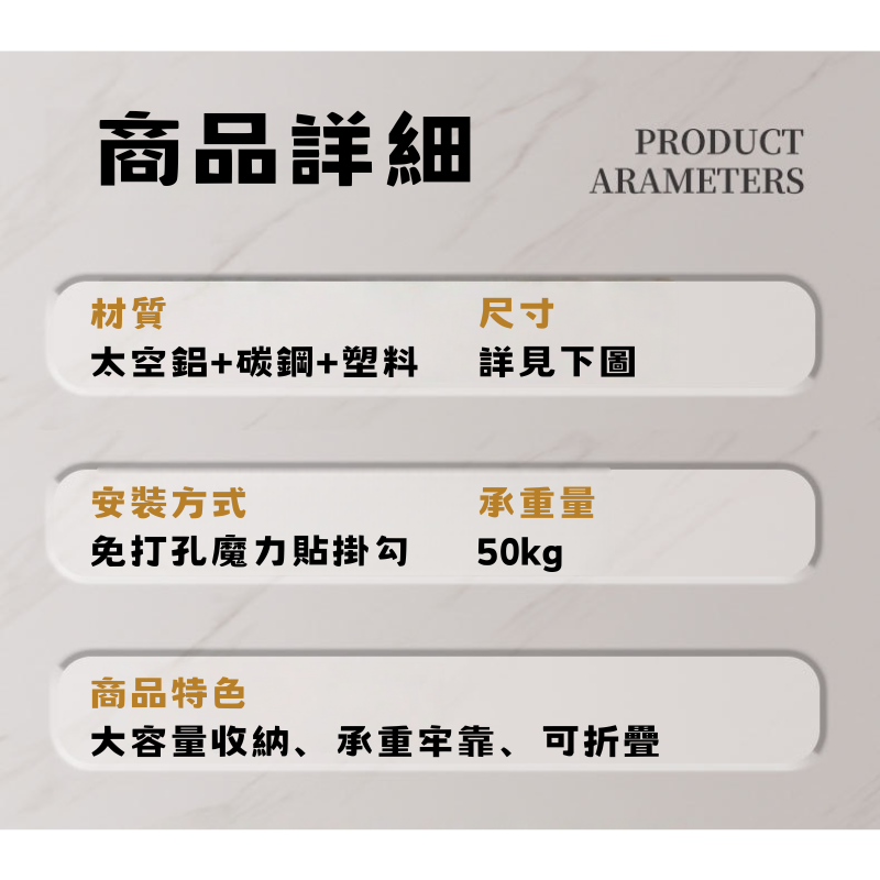 強大收納,無需打孔!此款浴室置物架採用優質太空鋁打造,具備卓越的防鏽性能,適合潮濕的浴室環境。獨特的免打孔魔力貼設計,安裝超簡單,卻能承重高達50kg!