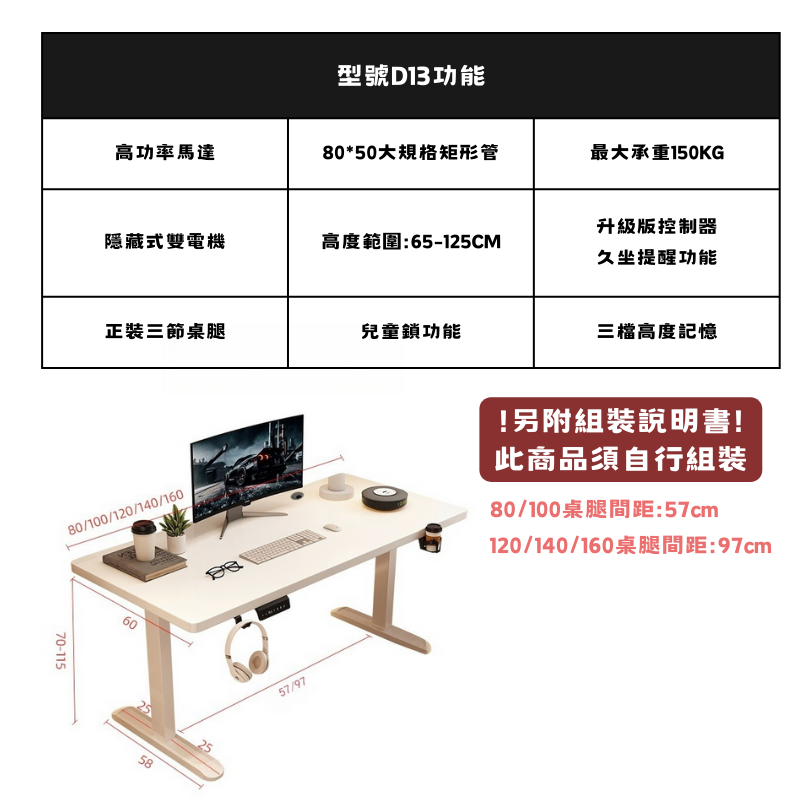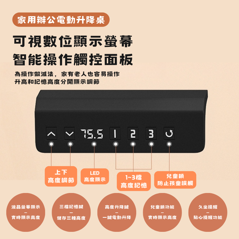 • 智能升降:LED顯示高度,三檔高度記憶,一鍵輕鬆調整。
